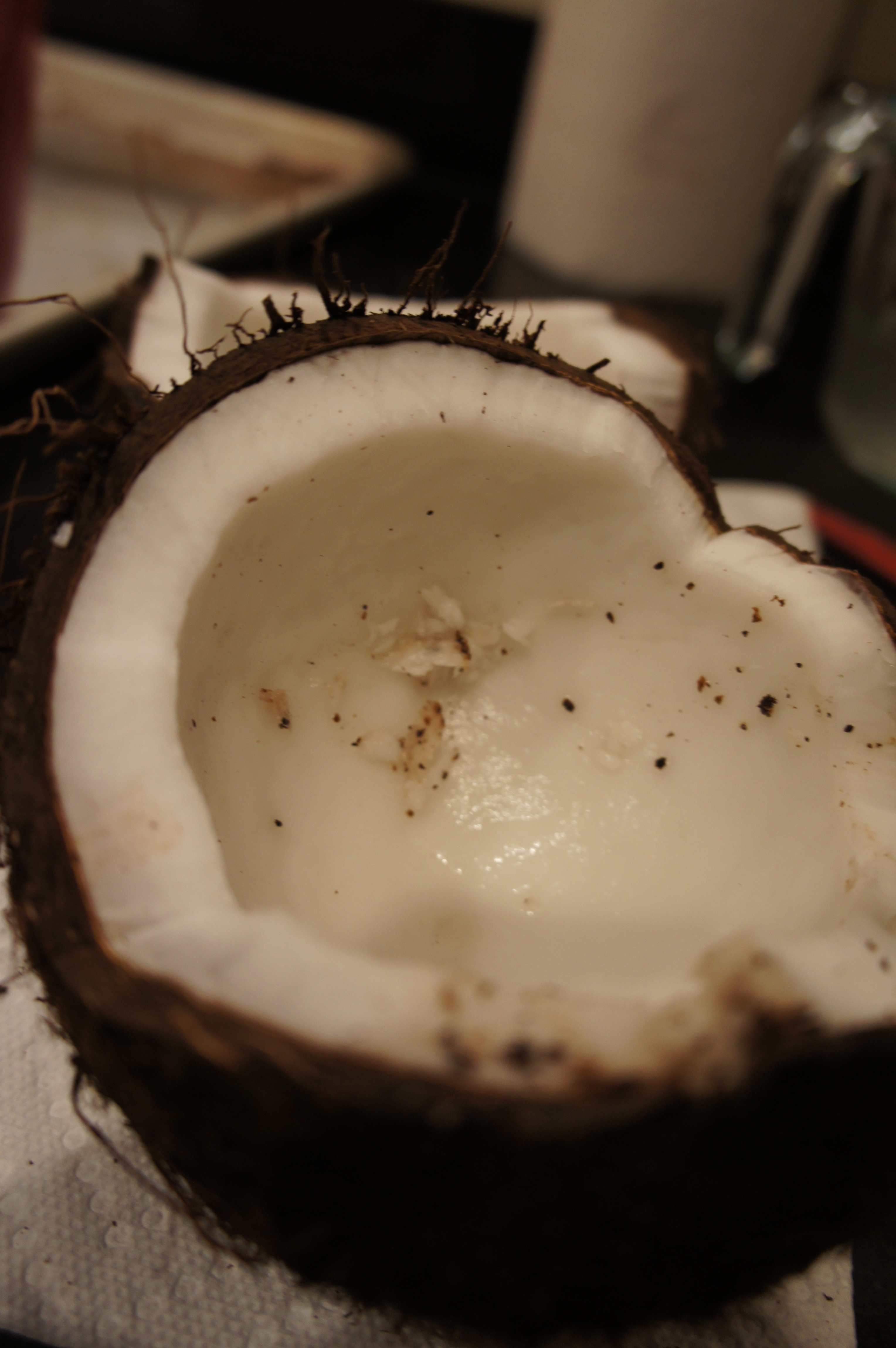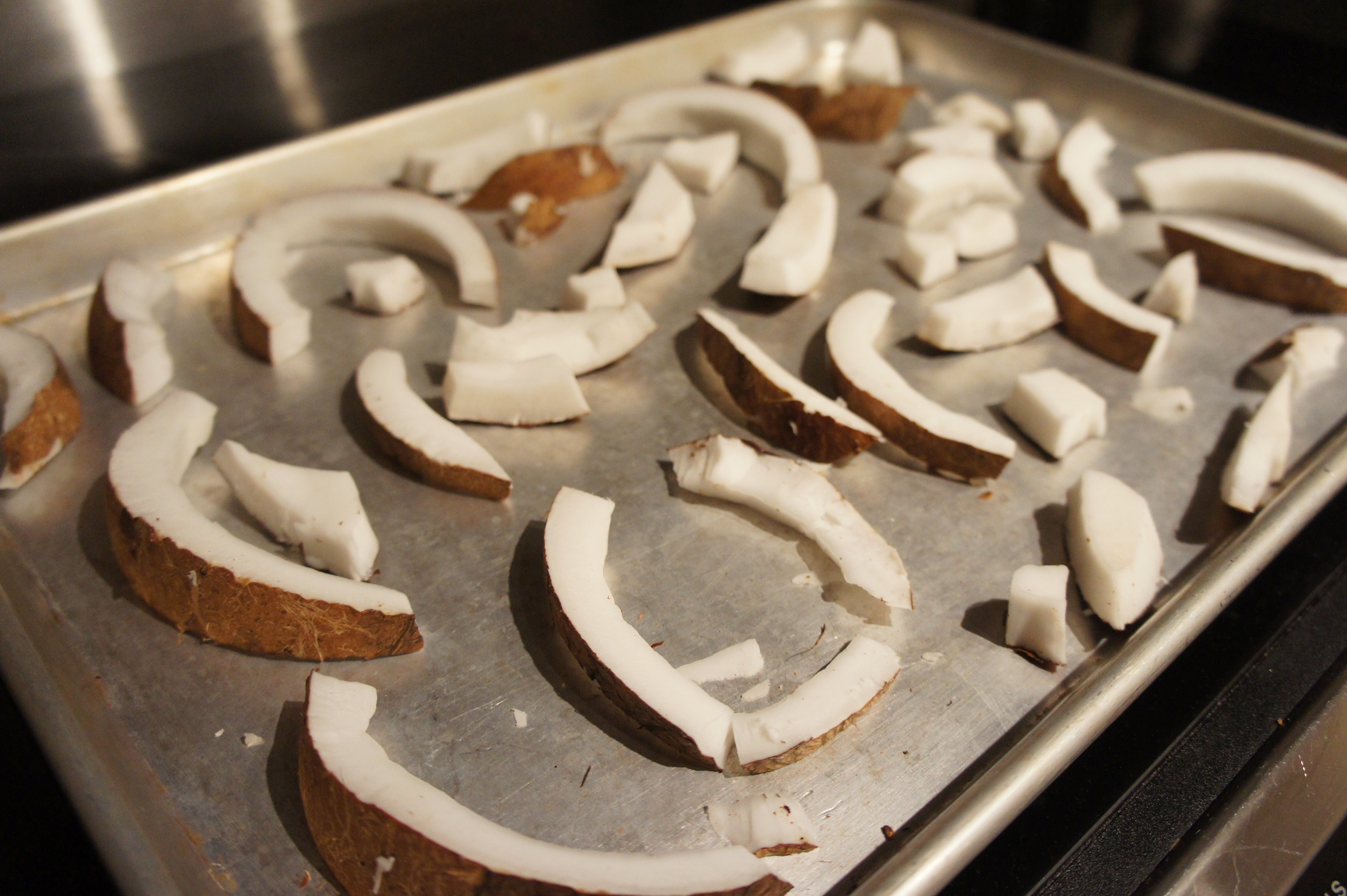 So, I bought two coconuts with the intention of making these roasted coconut strips in my oven. One of the coconuts was horribly rotten (thanks a lot you stupid Safeway!) and the second (and organic from the Fresh Market, my new favorite store) coconut was just wonderfully fragrant and beautiful. Of course I spent about 30 minutes trying to figure out how to open that coconut without breaking my counter. I whacked it a bunch with my rolling pin (sorry baby, those dents aren’t coming out are they) and then poked it some with a chopstick before I finally cracked that baby open.