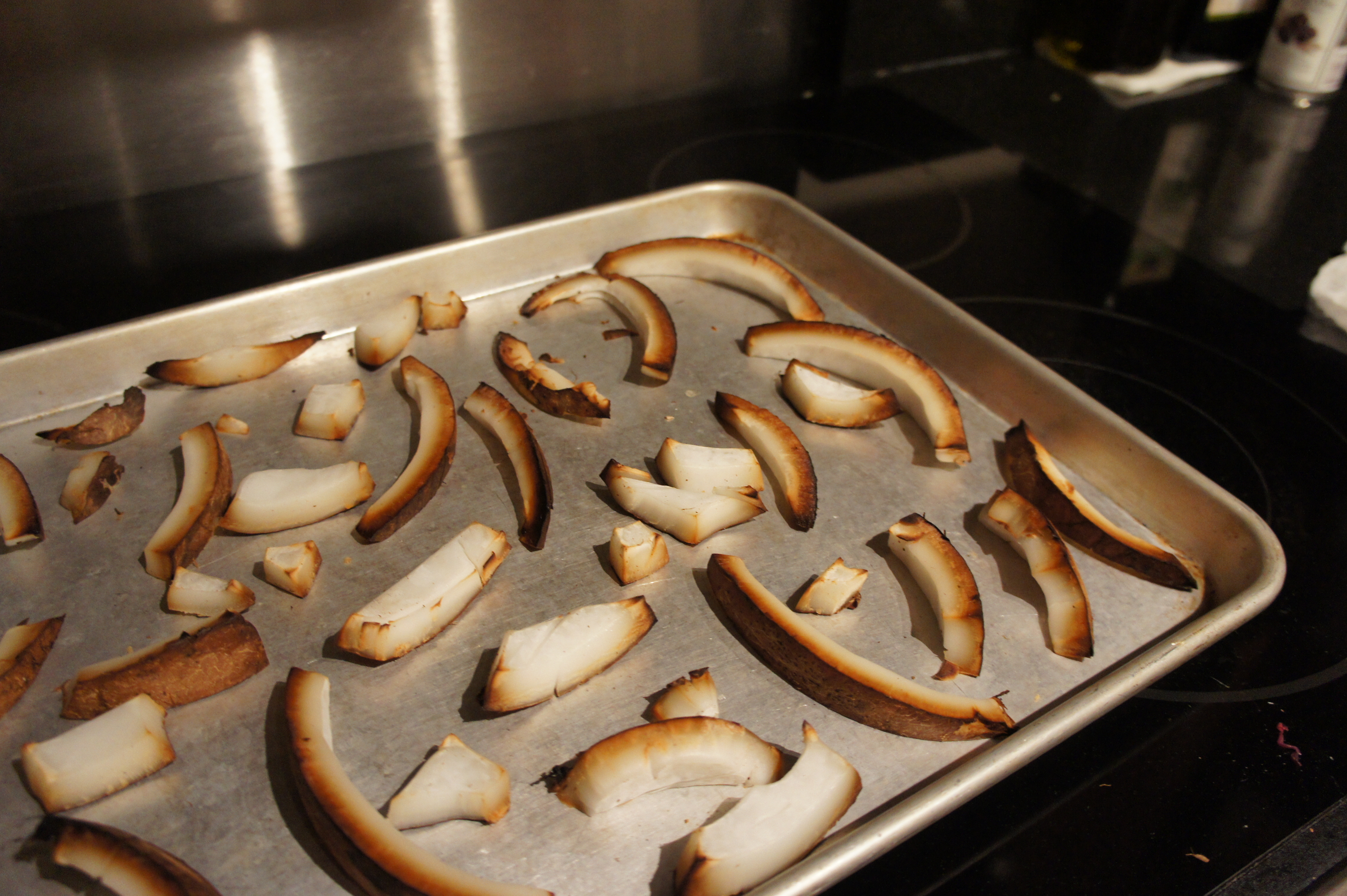 After prying those little strips out of their shell, and roasting them under the broiler for 15 minutes… I had these piping hot strips of coconut. Delicious!!!